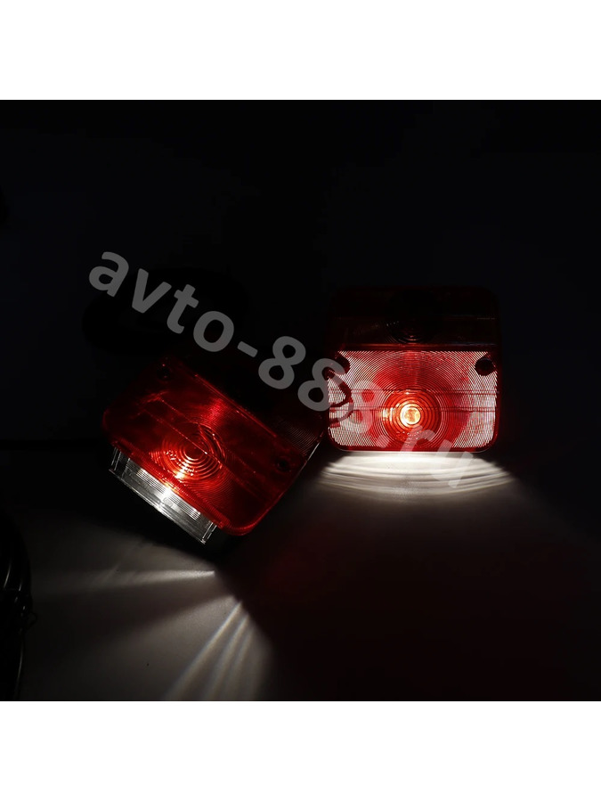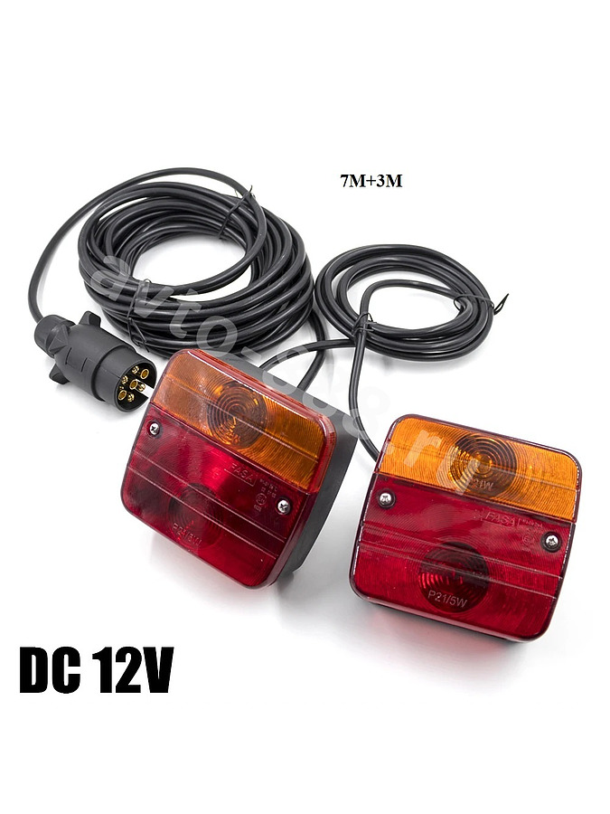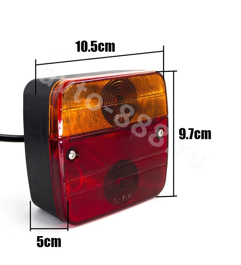 Автомобильные светодиодные фонари — яркость и надежность в любую погоду Светодиодные фонари с водонепроницаемостью IP65 обеспечивают 360-градусную видимость прицепа даже в густом тумане или дожде. Установите их за 15 минут и забудьте о проблемах с освещением и штрафах за неисправные габариты. Преимущества Низкое энергопотребление снижает нагрузку на аккумулятор на 70% по сравнению с галогенными лампами. Срок службы 50 000 часов — в 5 раз дольше аналогов, без частой замены даже при интенсивной эксплуатации. Водонепроницаемость IP65 гарантирует работу в дождь, снег и пыль без потери яркости. Универсальная совместимость с 12-вольтовыми системами — подходит для легковых авто и прицепов без адаптеров. Комбинированный свет (красный + желтый) обеспечивает видимость на 200 метров, снижая риск ДТП на 40%. Применение Используйте на прицепах для соблюдения ПДД в темное время суток и условиях ограниченной видимости. Монтируйте как стоп-сигналы и поворотники, совместимые со стандартом ISO 1724 (контакты 1, 4, 6). Применяйте в регионах с частыми осадками — защита IP65 исключает поломку даже при мойке высокого давления. Комбинируйте с габаритными огнями (контакты 5, 7) для создания единой световой системы прицепа. Устанавливайте на садовые и строительные прицепы для безопасной буксировки в любых условиях. Характеристики — Напряжение: 12 В — Цвет света: красный (стоп-сигналы), желтый (поворотники) — Цветовая температура: 3000–4000 К — Габариты фонаря: 10,5×10×5 см — Длина провода: 2,5 м + 7,5 м (итого 10 м) — Материал: АБС-пластик — Расстояние между винтами: 5,7 см