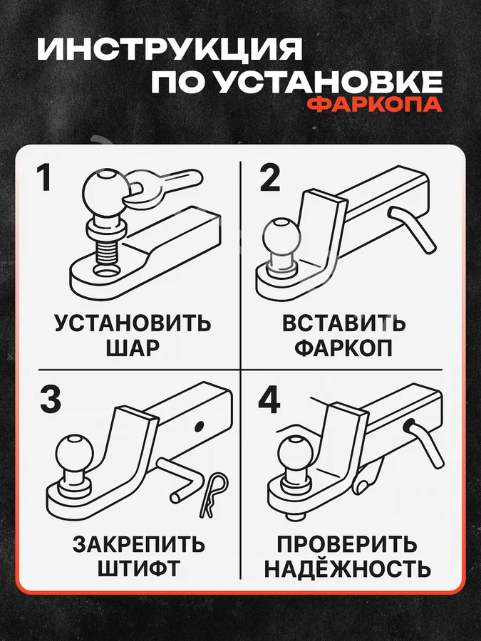 Полная комплектация: В набор входит усиленный кронштейн, хромированный сцепной шар, стопорный палец и шплинт.