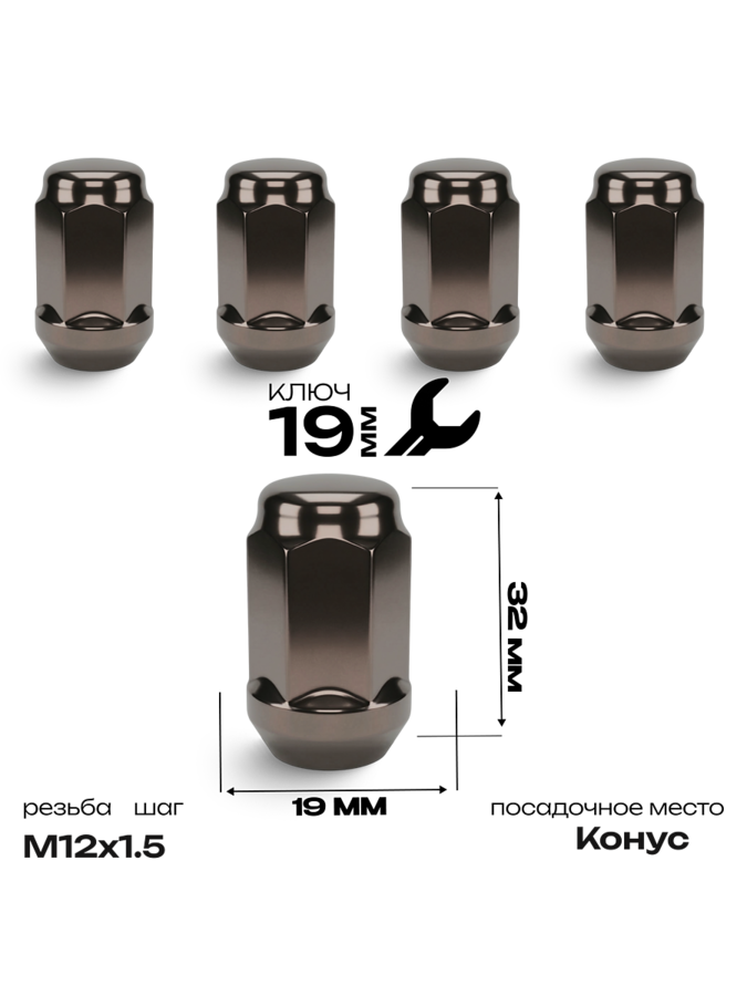 Гайки колесные FEINREX M12x1.5 закрытые L35 (конус 60°, ключ 19 мм) темно-серый — комплект 5 шт. 14532
