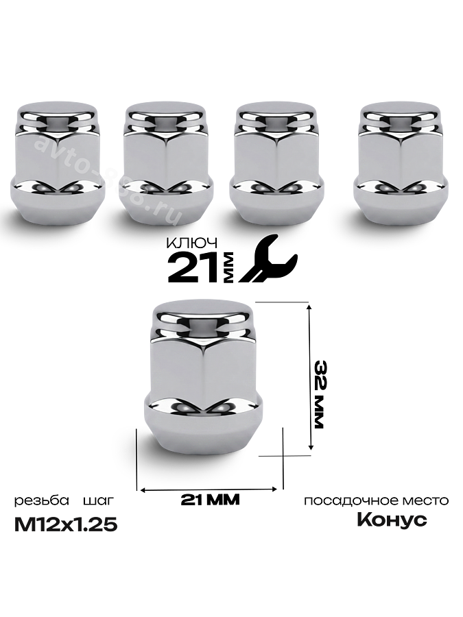 Гайки колесные FEINREX M12x1.25 закрытые L35 (конус 60°, ключ 21 мм) хром — комплект 5 шт. 14683 avto-888.ru