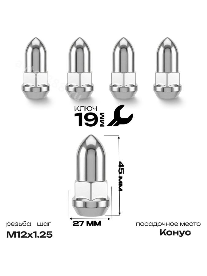 Гайка на колесо М12*1.25 конус (ключ 19) L45 ПИКА хром (5шт) C1006B C1006B avto-888.ru