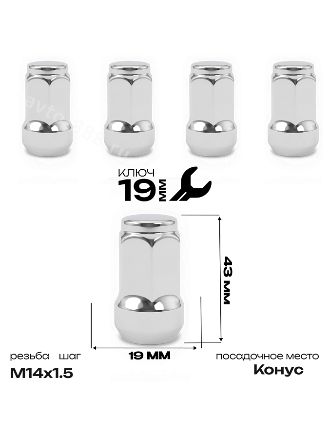 Гайка на колесо М14×1.5 конус (ключ 19) L45 хром (5шт) 1909L44 ACS-INSTR-1909L44