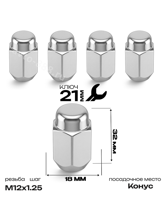 Гайки выполнены из высокопрочного стального сплава и имеют качественное хромированное покрытие, которое не только защищает металл, но и придает автомобилю эстетичный, законченный вид. Размер под стандартный баллонный ключ на 21 мм делает их установку и демонтаж максимально удобными.