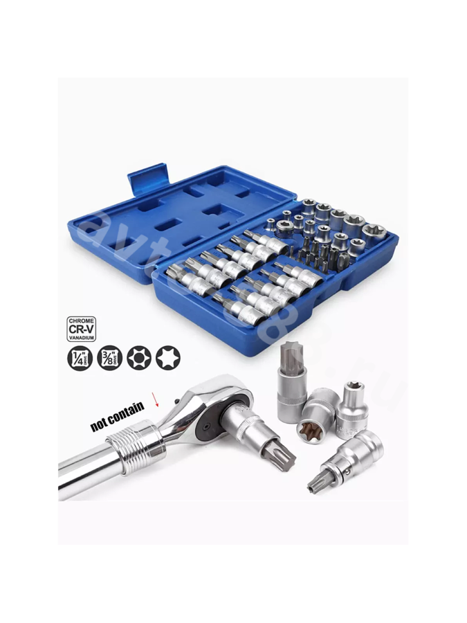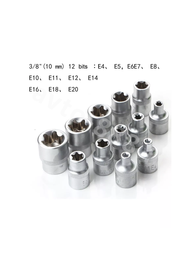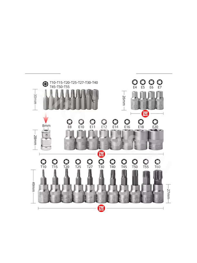 Набор звездочек-головок и насадок 29 предметов. 11 шт. Torx E-образный рукав: 3/8 дюйма (10 мм) : E10-E12-E14-E16-E18-E20 1/4 дюйма (6,35 мм) : E4-E5-E6-E7-E8 10 шт. гнездо Torx: 3/8 дюйма (10 мм): T10-T15-T20-T25-T27 1/2 дюйма (12,5 мм) :T30-T40-T45-T50-T55 7 шт. Бит сверло Torx со средним отверстием: T8-T10-T15-T20-T25-T27-T30 1 шт. Шестигранное гнездо для бит: 1/4 дюйма (6,35 мм) Изготовлен из высококачественной стали. Набор головок - это набор инструментов, который включает в себя различные типы головок, такие как торцевые головки, звездочки и другие. Эти головки могут использоваться с различными ключами и инструментами, включая набор ключей для машины. Головки набора позволяют быстро и легко заменять и поджимать болты и гайки, делая работу более эффективной и удобной. Набор торцевых головок является основным инструментом в наборе головок, и используется для затягивания или разворачивания гаек и болтов на местах, где доступ к ним ограничен. В целом, набор головок является необходимым инструментом для любого автомобилиста, механика или технического специалиста. Он позволяет быстро и легко заменять и поджимать болты и гайки, делая работу более эффективной и удобной, а также предоставляет широкий набор инструментов для различных задач.