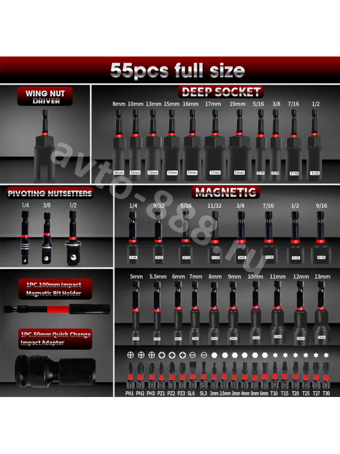 Набор ударных торцевых головок и бит для шуруповерта 55 предметов FR-14594 avto-888.ru