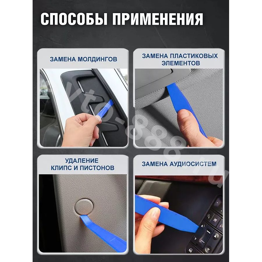 Набор съемников 19 предметов от Авто Центр для снятия обшивки, клипс, пистонов в салоне и багажнике автомобиля. Комплект инструмента для разборки салона авто, позволяет аккуратно разобрать салон, сделать шумоизоляцию без повреждений элементов, провести демонтаж внутренней обивки, молдинга, магнитолы, торпедо и других пластиковых частей внутренней отделки, не царапая и не нанося повреждений окрашенным, хромированным и другим поверхностям. Набор инструмента является универсальным и подходит под любые машины легковых и грузовых , любой марки (лада (Lada), рено ( RENAULT) , ниссан (nissan), киа (kia), хендай (Hyundai ) , ВАЗ, митсубиси (MITSUBISHI) , сузуки ( Suzuki ), вольво ( volvo), ГАЗЕЛЬ и др. В наборах присутствует различные виды наборов ключей съемников лопатки, скребок для стекол, шпатель, ключи, вилочки и клипсодеры для работ: обшивки салона, инструмент для разборки салона; Облицовки панелей и клипс. Набор для установки и снятия радио/cd проигрывателя автомобиля и др. В ассортименте имеются комплекты, включающие в себя 19, 38, 32, 40, 45 - предметов из высококачественного пластика. Удобный кейс органайзер не занимает много места при хранении и транспортировке в салоне или багажнике с набором ключей или наборами инструментов для автомобиля по ремонту и строительству или набором автомобилиста. Отличный мужской набор, подарок для мужчины, подарок автомобилисту, автолюбителю, автомастеру на любой праздник : 23 февраля, Новый год, Рождество, День Рождения, Годовщина, День Святого Валентина (день влюбленных, Юбилей, День Отца, День Учителя и др. Набор автомобилиста для него , ремкомплект для папы, дяди, брата, сына, любимого мужа, парня, зятя, тестя, свекру, дедушке, коллеге, боссу, руководителю и др.
